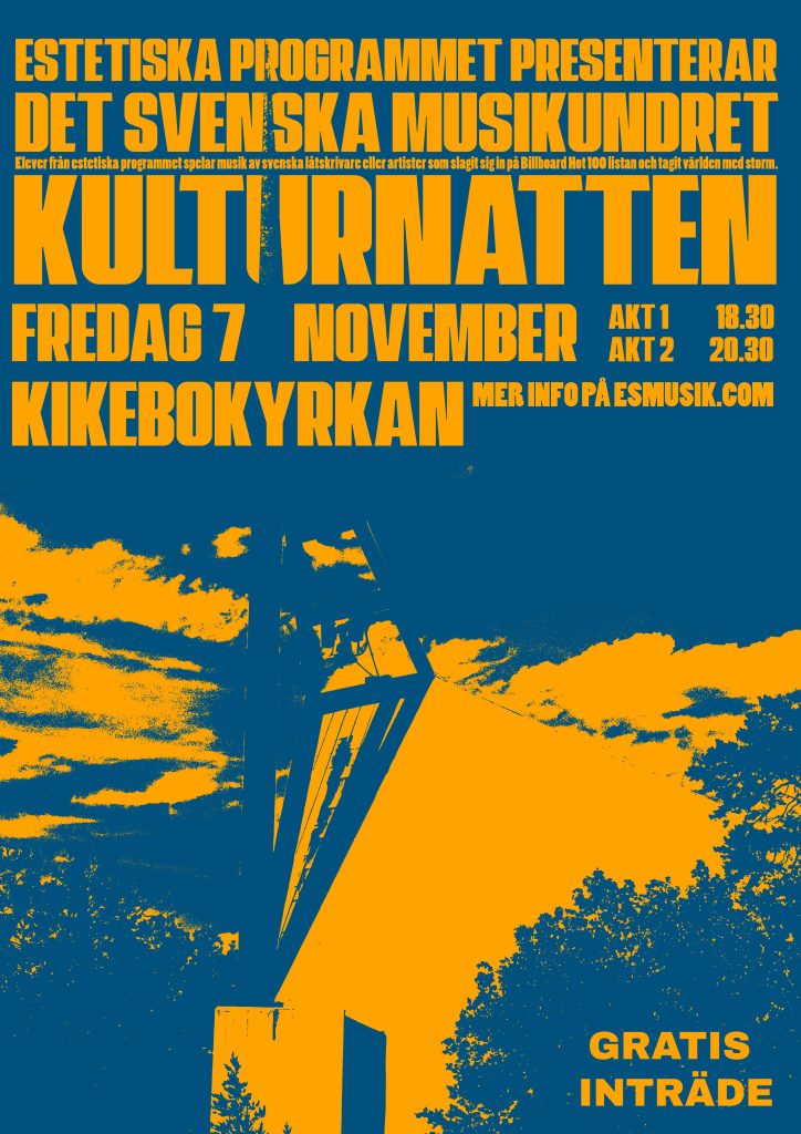 Iår flyttar Estetiska programmet in på Kikebokyrkan för sin medverkan på Kulturnatten. Vi kommer framföra två olika program. Ett uppe i kyrkan med kör, jazz etc. Och ett program nere i källaren med våra afroensembler.